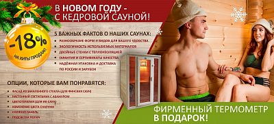 *Скидка 19% действует на все финские и инфракрасные сауны с керамическими нагревателями, скидка 9% действует на все инфракрасные сауны с карбоновыми нагревателями. При покупке любой инфракрасной сауны - дарим цветотерапию, при покупке финской сауны -  фирменный термометр. Акция действует до 10 апреля 2019 г.