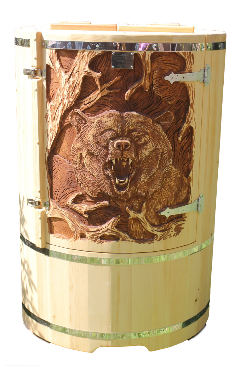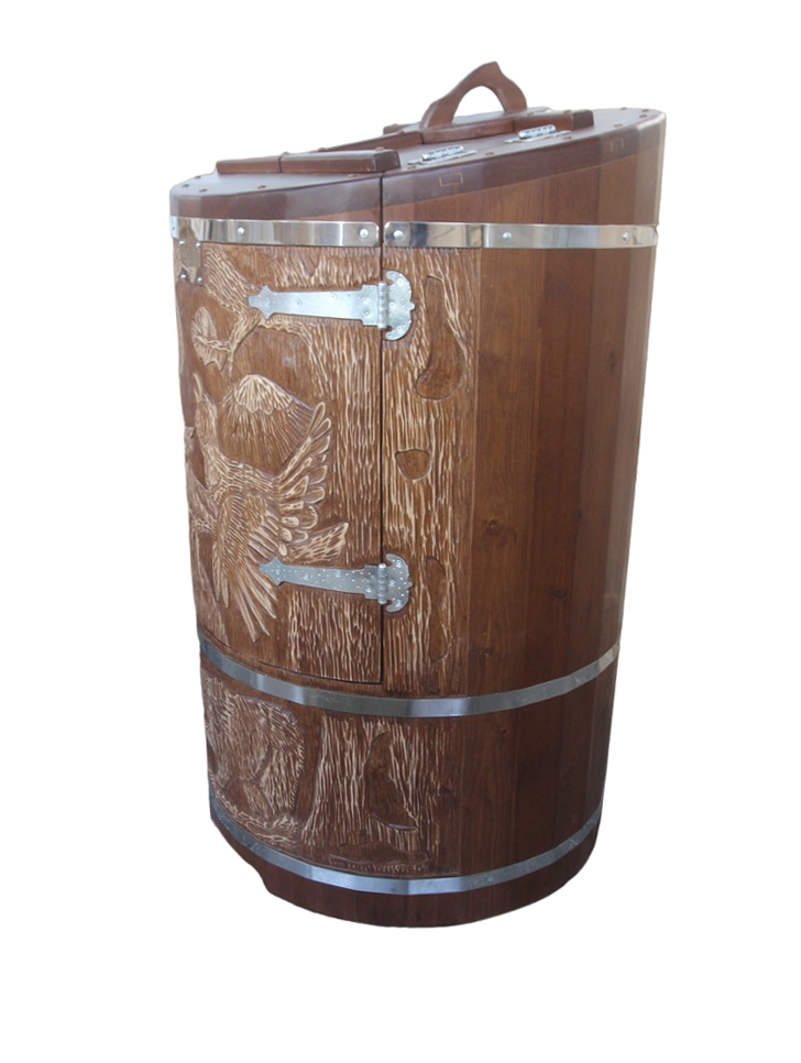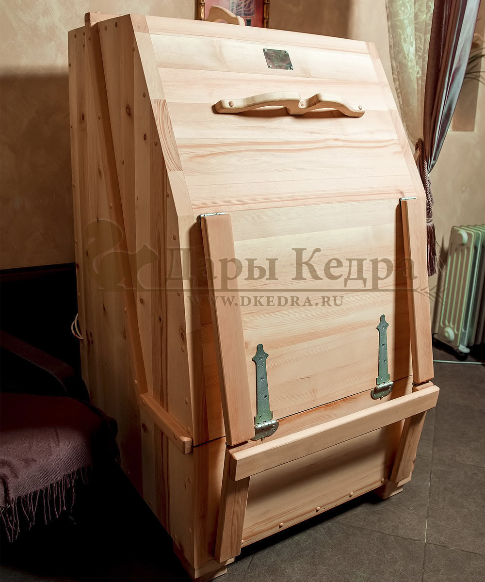 Квадратная двухрежимная фитобочка из кедра может быть использована как инфракрасная сауна и парная. Карбоновые излучатели отвечают за сухое парение, они находятся на внутренней стороне дверцы и задней стенке фитобочки. Влажное парение происходит за счет поступления горячего пара в фитобочку через паропровод. Толщина стенок составляет 40-45 мм, что позволяет увеличить срок службы изделия. Откидная дверь бочки во время открывания фиксируется внешней подставкой - опорой, которая в закрытом состоянии складывается и не занимает лишнее пространство. Во время парения человек сидит внутри кедровой бочки, а голова находится снаружи. Благодаря этому исключается возможность перегрева. Встроенная ручка на двери делают эксплуатацию фитобочки более удобной.