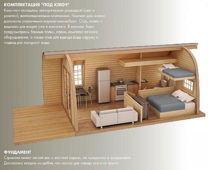 Чтобы установить кемпинг-домик по месту его размещения, достаточно заранее подготовить выровненную площадку. Кемпинг является облегченной версией дома, поэтому не требует полноценного фундамента, достаточно выложить тротуарную плитку или сделать насыпную площадку, установив обвязку брусом 150 мм. Главное условие - это воздухообмен между дном глэмпингом и площадкой. Нельзя устанавливать конструкцию на траву, неровную площадку. Потребуется организовать слив, если в доме имеется сан.узел или душевая кабина. Самым распространенным фундаментом для глэмпинга является каркасный фундамент с обшивкой террасной доской, смотрится стильно, дополняет конструкцию эко-дома.